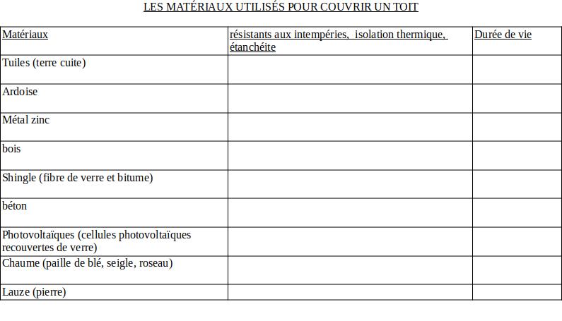 Le toit permet de protéger des intempéries. Il existe pour cela plusieurs solutions techniques (matériaux). Recherche les différents matériaux qu’il est possible d’utiliser pour couvrir un toit pour protéger des intempéries en précisant l’intempérie, ainsi que leur durée de vie. Complète le document suivant. Aide toi des sites suivants ( à l’exception des toitures terrasse, brande et tôle ondulée)