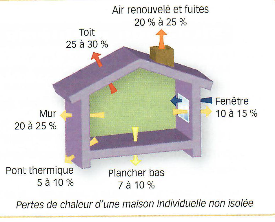 Dans un bâtiment, les déperditions de chaleur s’expliquent par le fait que l’air chaud de la maison va s’échapper pour rejoindre l’air froid. Ces pertes de calories dépendent des éléments du bâti