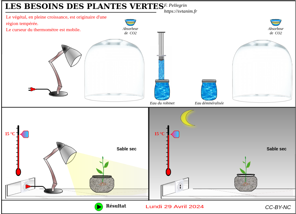 Tu va faire plusieurs expériences en plaçant à chaque fois dans la partie de gauche : de l’eau du robinet, la lumière et la température à 15°C. Ce sera le témoin. Tu placera dans la partie de droite à chaque fois plusieurs éléments SAUF 1 (expérience) et tu comparera les résultats avec la partie de gauche. Puis complète ton document